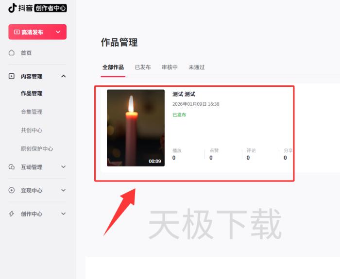 5.发布后即可看到视频已经出现在作品管理中。