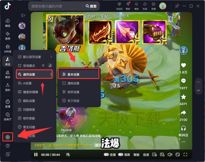 1.打开抖音,点击左侧的【设置】-【通用设置】-【基本设置】。