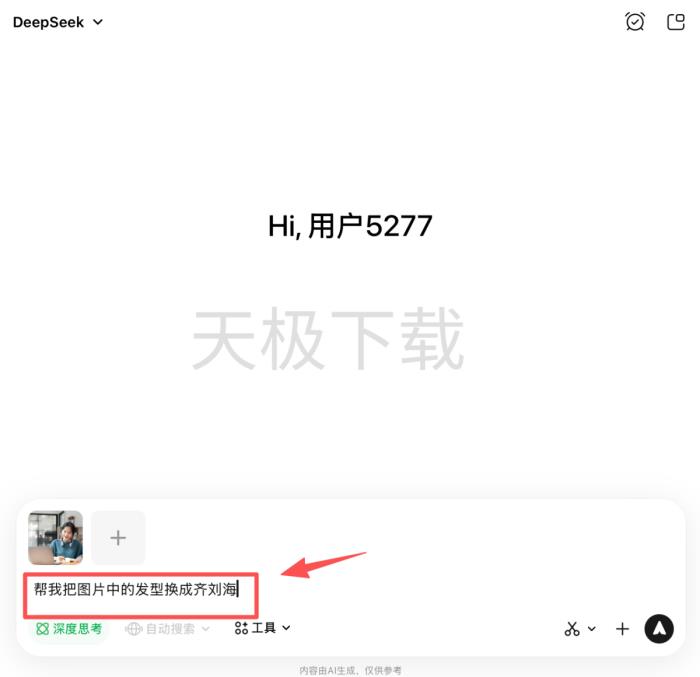 2.输入更换发型的指令,例如,帮我把图片中的发型换成齐刘海。
