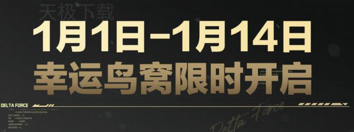 三角洲行动幸运鸟窝活动从2026年1月1日凌晨开始,一直进行到1月14日深夜,总共14天。