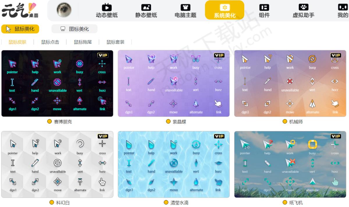 ●元气桌面:拥有丰富的桌面图标、鼠标指针美化模板,能够将桌面图标变成可爱、酷炫的风格,为鼠标指针添加点击、拖尾等特效。此外,还支持一键设置系统主题。