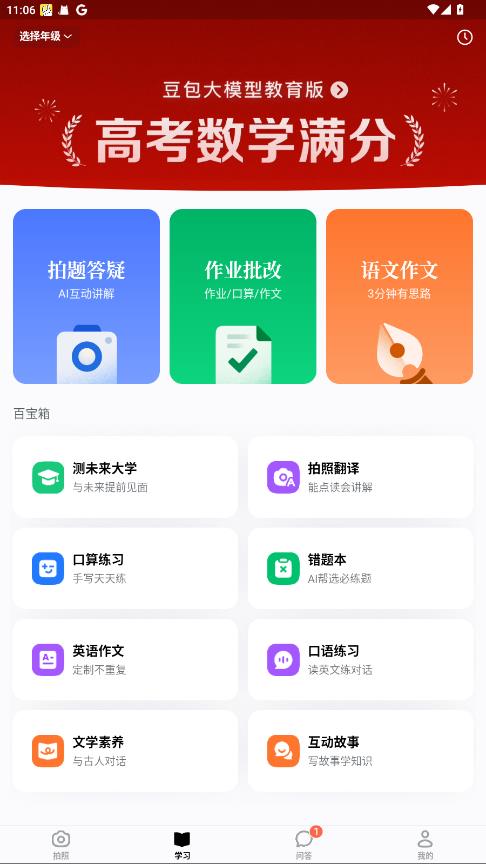 豆包爱学最新版本 5.2.8安卓版 分类:教育学习 大小:97.3M 热度:0 发布:2026-03-13 语言: 关键词: 豆包爱学学习智能学习豆包爱学最新版本下载 苹果下载 安卓下载 APP截图 应用介绍 豆包爱学最新5.2.8安卓版可真是个全能学习助手,强大的AI功能,能让你的学习效果蹭蹭上涨。不管是帮你解析难题,还是讲解知识点,都能提高你的理解力。作业批改和错题整理也不在话下,让你更好地巩固知识,避免犯同样的错。还有,中英文作文写作这块,它也能给你不少灵感,让你写作时更加得心应手。豆包爱学怎么删除搜题记录1.在学习首页点击右上角历史记录。2.点击右上角垃圾箱按钮。3.勾选要删除的记录点击删除即可。豆包爱学怎么退出身份证账号1.在下栏我的点击设置。2.点击家长模式。3.切换成学生模式即可。 相关应用 玩机资源库官方版 1.2.8安卓版 椒盐音乐去广告版(Salt Player) 11.0.4最新版 哀鸿:城破十日记 官方正版 瓜子影视2026官方最新版 3.0.4.0安卓版 开店模拟器 口袋故事官方版 11.68.1手机版 疯狂猜诗词 Iconify最新版本 7.2.0官方版 onedrive安卓版 7.50 (Beta 2)最新版 恋爱与选举与巧克力 手机版