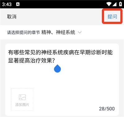 3、选择你想要提问的章节,然后输入文字或者添加图片,完成后点击右上角的【提问】。