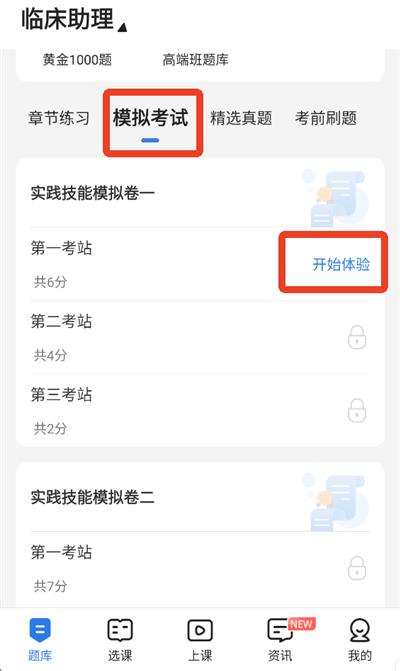 星题库App怎么模拟考试1、首页下滑点击【模拟考试】,点击事件技能模拟卷一的第一考站,这个可以免费体验,其他的需要解锁会员。