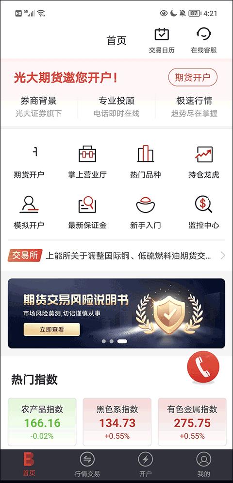 光大期货e开户app是由光大证券全资子公司设计的一款期货开户软件,这款应用集合了期货开户、行情查看、期货和期权交易、研究资讯、投资者教育以及掌上营业厅等多项功能,国内期货交易所的期货和期权都能搞定,用户的各种交易需求都能满足。为了确保投资者的安全,系统采用了CTP技术架构,安全性能已经达到了交易所的级别,是当下业内先进又安全的解决方案之一,可以保障核心交易,不让单点故障有机可乘。深圳的光大期货有限公司分公司负责这项服务。