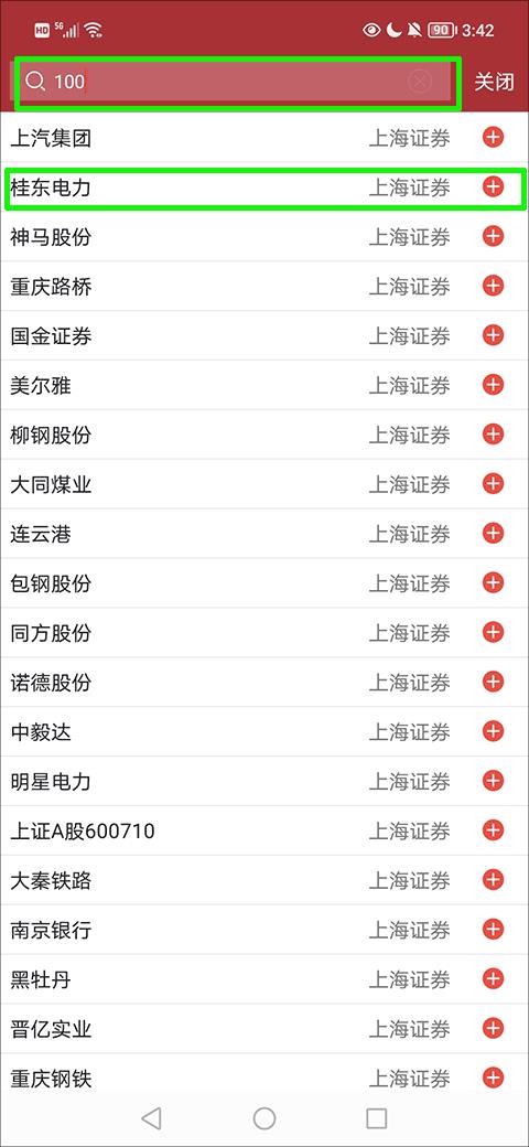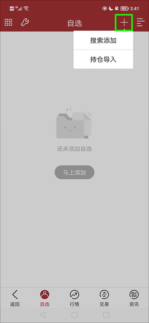 2、在行情界面的自选一栏中找到并点击绿色方框内的选项,在弹出的选项框中选择“搜索添加”选项;