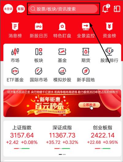 指南针股票app添加自选股教程1、打开登录指南针股票app,在点击首页上方【搜索栏】查找;
