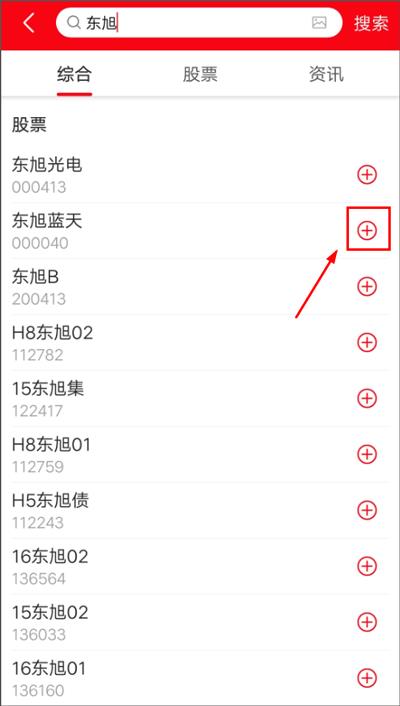 2、在【搜索栏】内输入自己需要的股票进行搜索查找,出现搜查结果后,点击股票旁边的【 】图标将其加入自选股内;