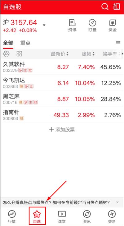3、用户添加好的多支自选股,可点击首页下方【自选】查看到;