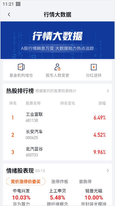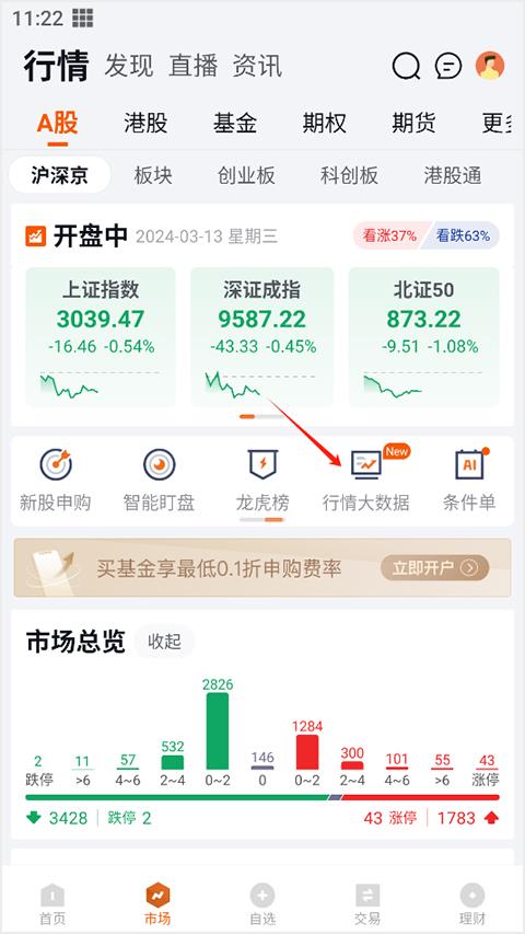 天风高财生手机版如何查某一天某个股票明细?1、进入软件后,在行情页面选择行情大数据选项,也可以选择在上方进行搜索