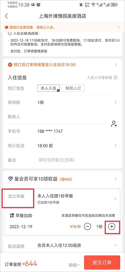 2、点击预订后进入订单页面,点击活力早餐选项,然后点击右边 号进行加购早餐