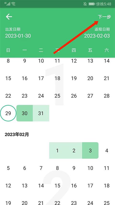 2、开始选择“出发日期”和“返程日期”,然后选择右上角“下一步”选项,