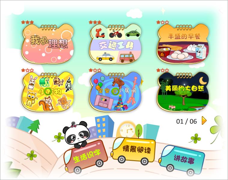 -《熊猫阅读》包含生活识字、情景阅读、讲故事三大模块内容,合计近百课时内容