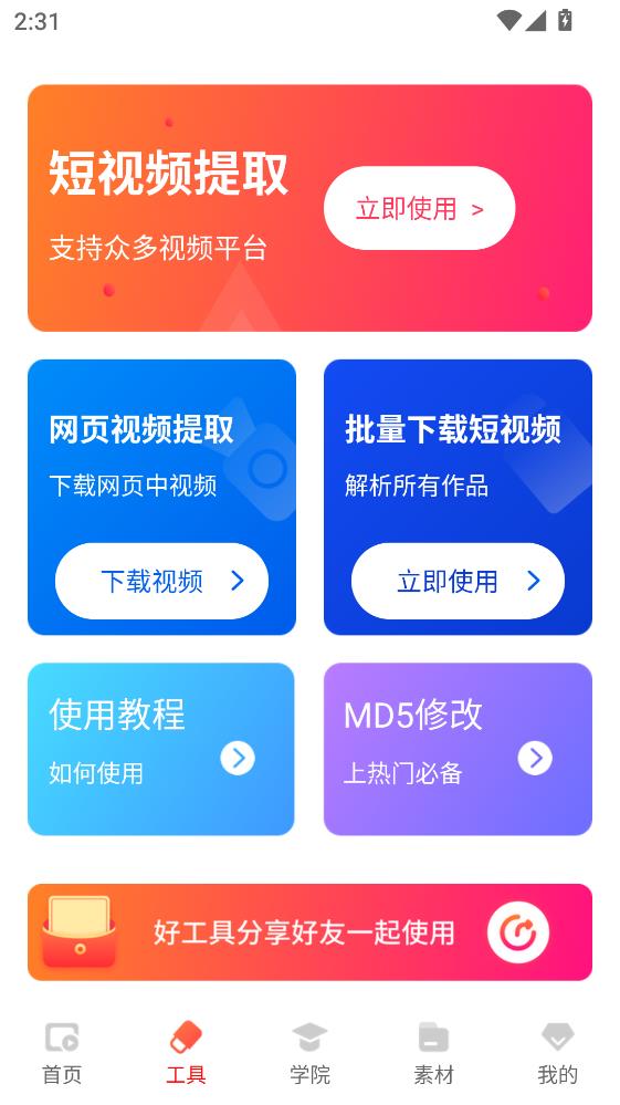 2.在工具中提供短视频提取、网页视频提取、批量下载短视频、MD5修改等功能。