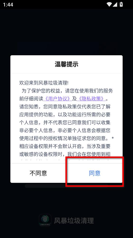 1.打开风暴垃圾清理app之后首先需要同意温馨提示。