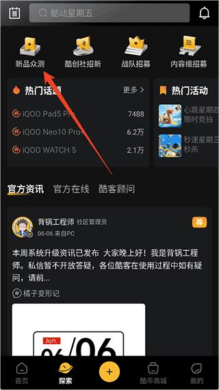 iQOO社区怎么申请内测?1、用户可以进入app的探索界面中点击【新品众测】