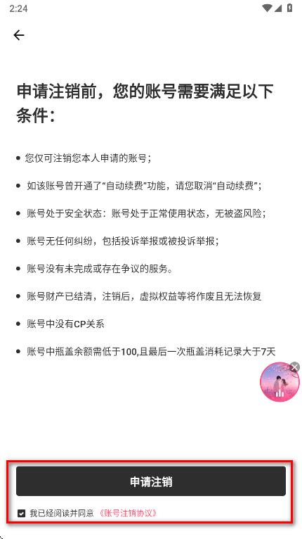 7.勾选我已经阅读并同意《账号注销协议》,点击申请注销。