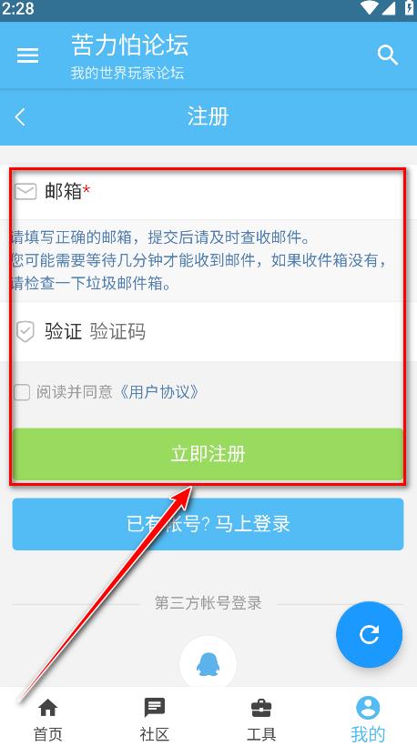 输入邮箱、验证码、勾选阅读并同意《用户协议》,点击立即注册即可。