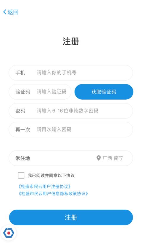 桂盛市民云怎么注册1.进入软件输入手机号获取验证码进行注册