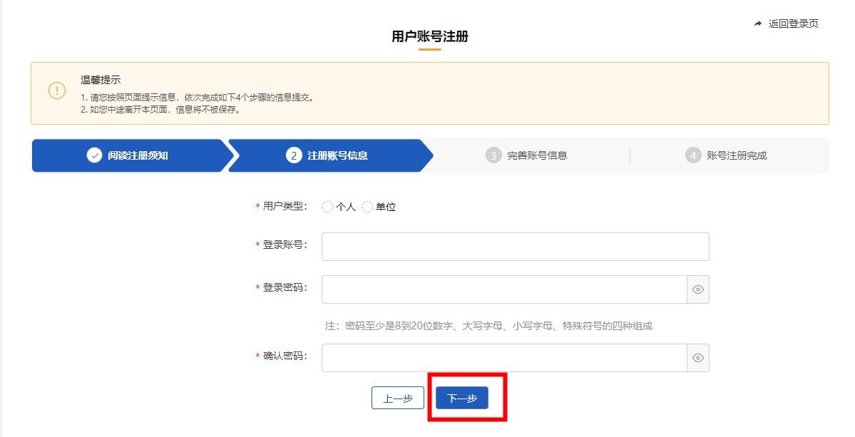 填写注册账号信息,包含: 用户类型、登录账号、登录密码、确认密码、手机号码、图形验证码、短信验证码、电子邮箱 ,填写完成后点击 [下一步] 按钮。