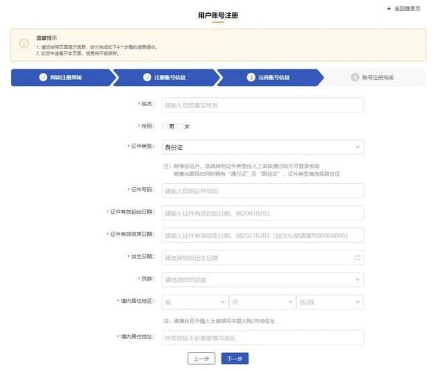 完善账号信号,包含: 姓名、性别、证件类型、证件号码、证件有效起始时间&结束时间、出生日期、民族、境内居住地区、境内居住地址 ,填写完成后点击 [下一步] 按钮。