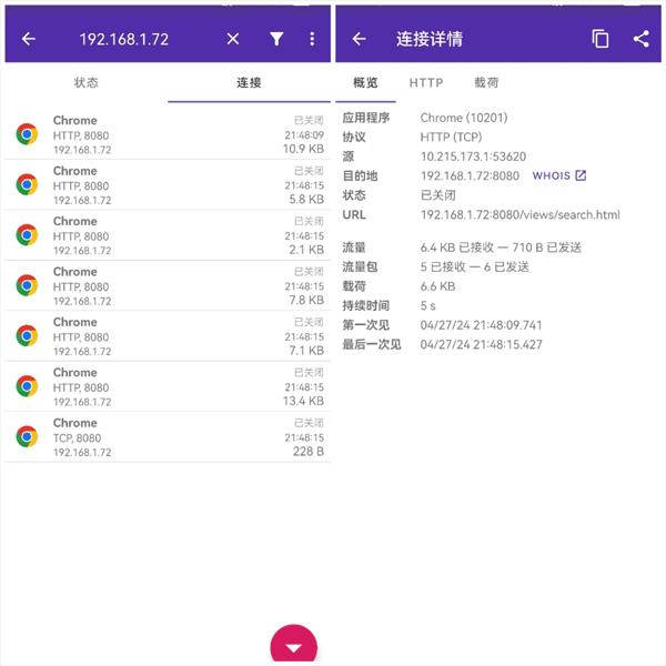 左图通过搜索框过滤特定目标主机,可以看到这些连接目前已经是关闭状态(CLOSED),因为用的是短连接场景;任意点选一个连接可以看到概览信息,包括连接持续时间,访问的URL、协议、进程APP和进程ID,以及产生的流量大小和载荷长度: