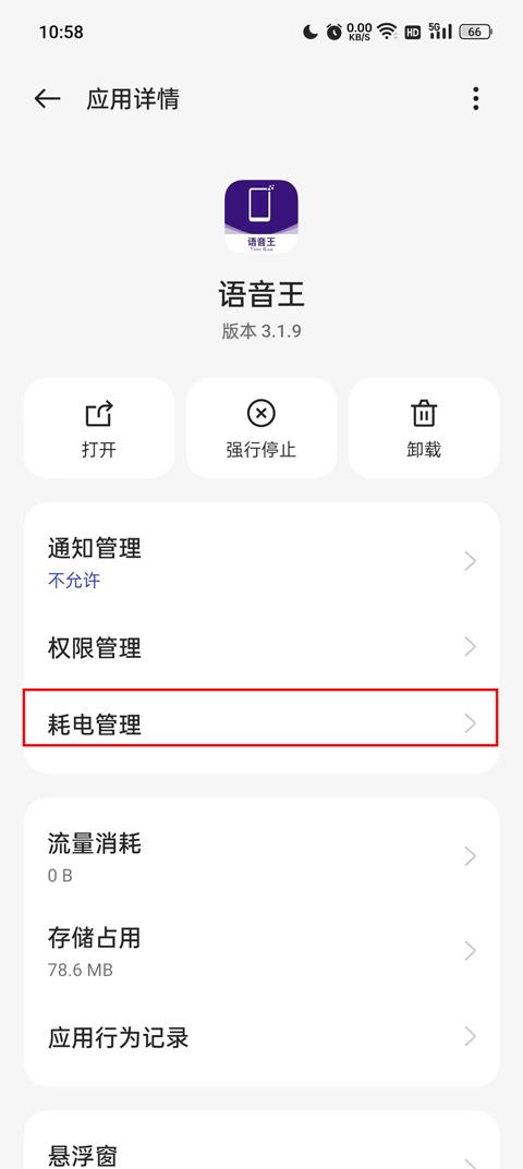 2、找到电池优化,会来到语音王应用详情页面,点击耗电管理进入;