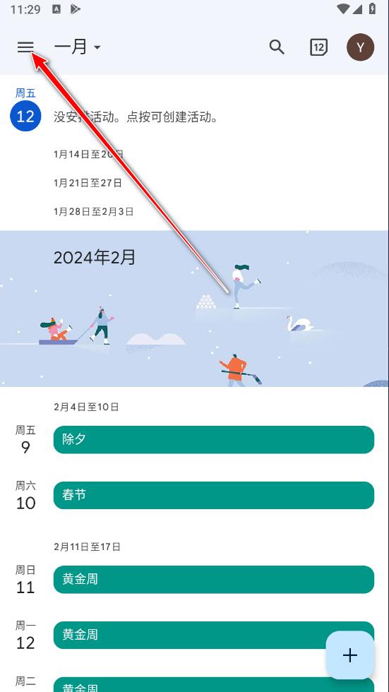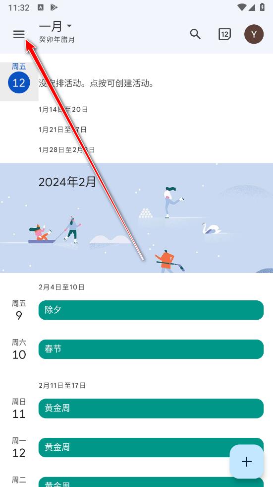 打开谷歌日历app,点击左上角的菜单按钮