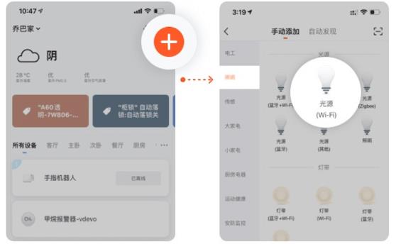 第二步:在App首页点击" "号添加设备