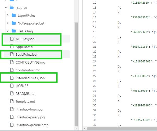 5.不过这里小编可是把最新的代码全部复制过来了,这里主要提供了三个规则代码,一个是基础规则代码、一个是扩展规则代码、一个就全部规则代码,从字面上意思也不然理解全部规则代码就是包含了基础规则代码和扩展规则代码,这可不是小编在这瞎说的,是在github代码库列表中所呈现的。6.如下图所示,用户只要在代码列表中找到json文件即可,这些规则代码就是以json格式书写的,有点编程经验的用户一看到json文件自然就知道其强大的跨平台文件交换功能了,在很多编程场景都能用到,无论是c ,还是java,无论是前端还是后端开发者都要接触并使用到这种格式文件的。