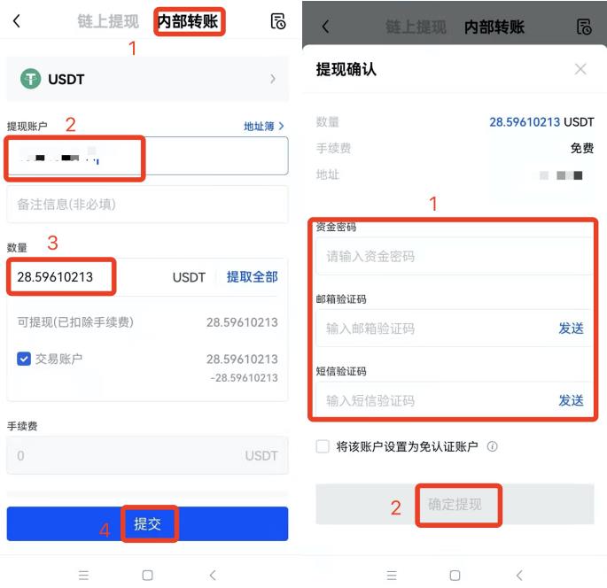 打开O易交易所APP,选择【资产】栏 —【提现】—选择币种【USDT】—选择【内部转账】—输入【提现账户】—【数量】—【提交】—按要求获取并输入相关密码/验证码—【确定提现】,完成操作。