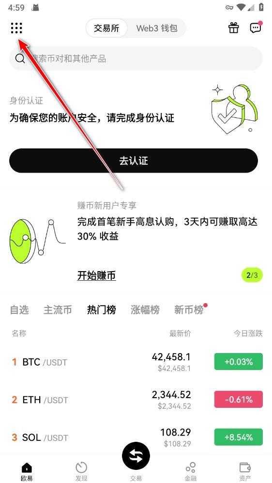 1.打开O易交易所app,点击左上角的菜单按钮