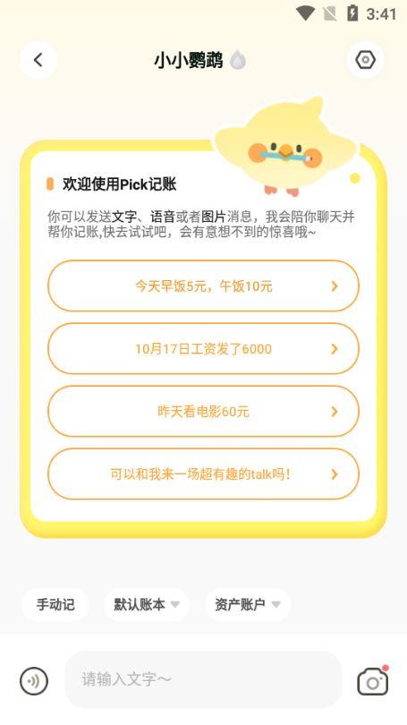 1、初次开启Pick记账时,使用者可与可爱的“小鹦鹉助手”展开交流互动,由此开启独属于自身的记账之旅。