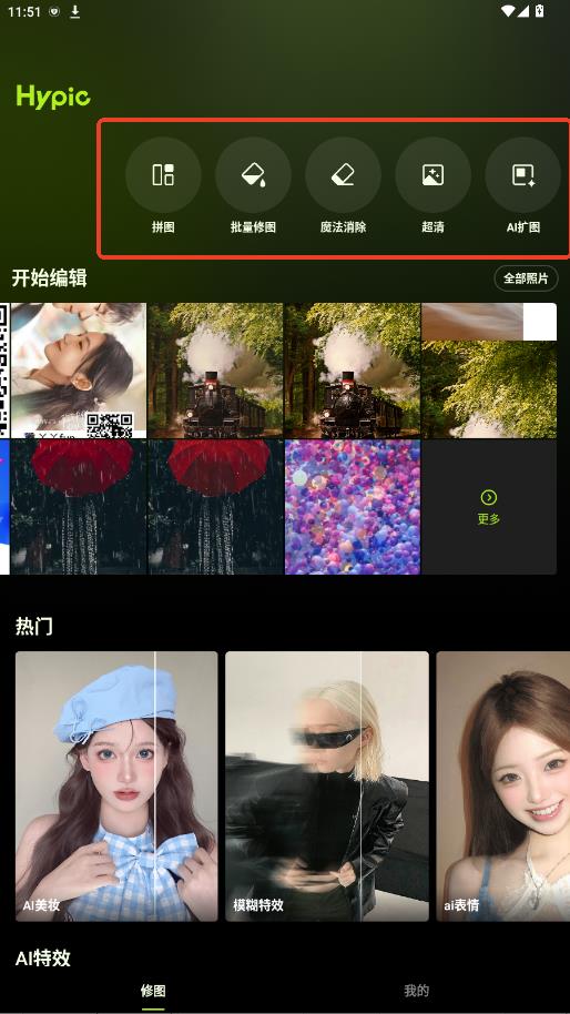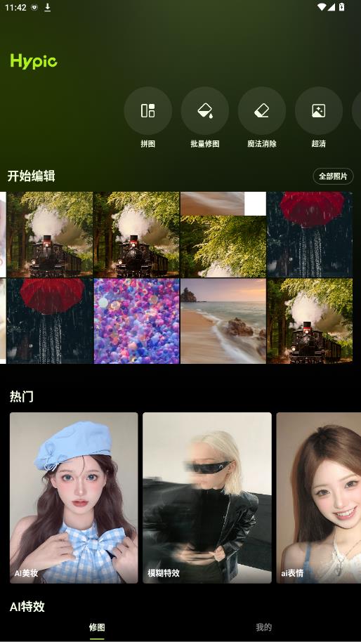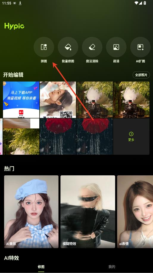 1.下载hypic点击打开,可以看到首页的功能布局,点击中间的【拼图】【批量修图】【我的项目】【消除笔】或是点击【 导入】进入修图页面