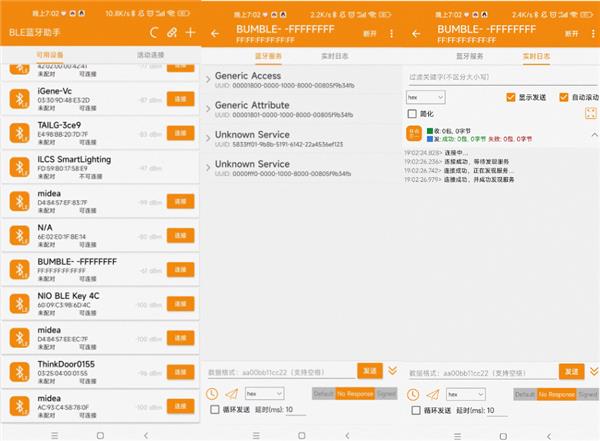 BLE蓝牙助手是一款非常实用的蓝牙调试工具,专门为用户优化蓝牙模式、参数和系统设置,让你轻松掌控蓝牙所有功能。这个软件可以帮你解决安卓设备的蓝牙连接问题,比如功能缺失或突然断连。它功能强大,支持BLE4.0及以上设备通讯,能实时扫描设备、显示信号强度,还能列举服务特征值。操作起来特别简单,一键搞定,适用于各种安卓设备,安全性也很高。还有一些特色功能,比如加收藏和扫描二维码连接,绝对能满足你的蓝牙调试需求。