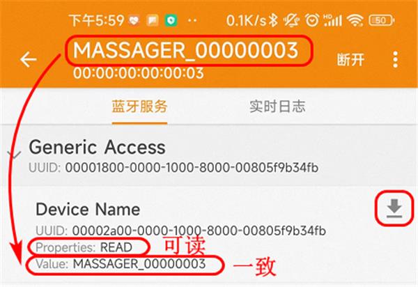 4、比如服务Generic Access里面有个特性是Device Name 设备名,属性Properties为Read可读,界面有个向下的箭头代表download,点击就能读出Value,和最上面的蓝牙名称是一致的;
