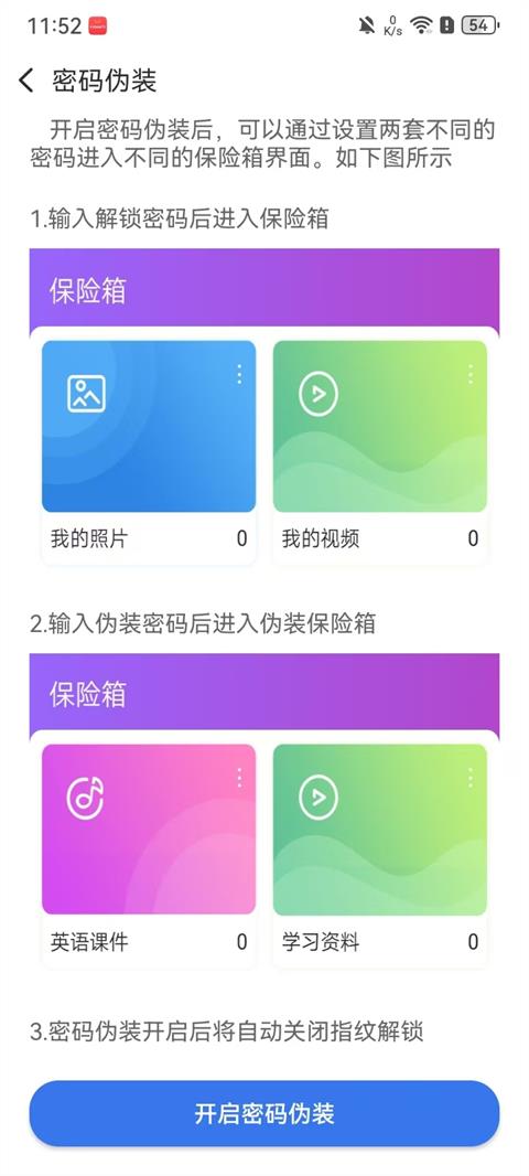 2. 密码伪装很巧妙,依据不同密码进入各异保险箱界面,可避免尴尬情况。