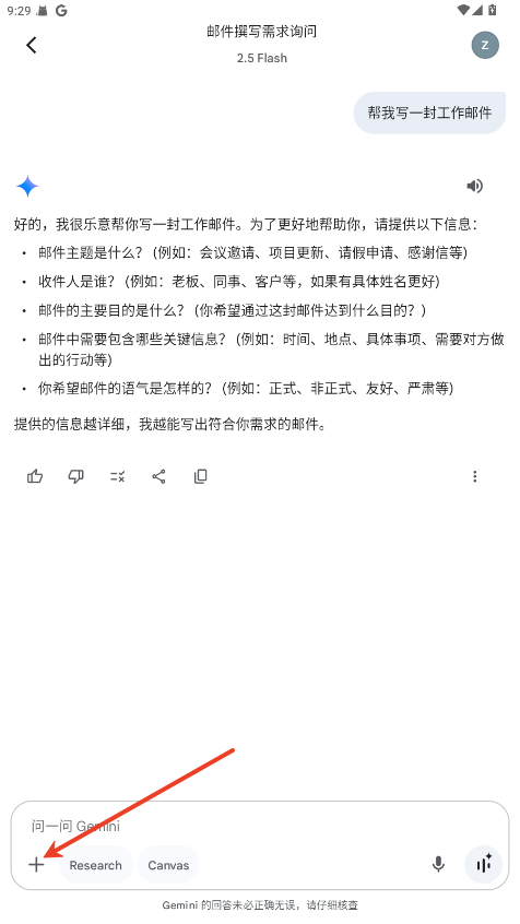 输入文字:直接键入问题或请求,例如“帮我写一封工作邮件”。