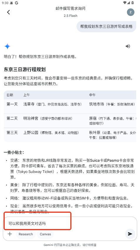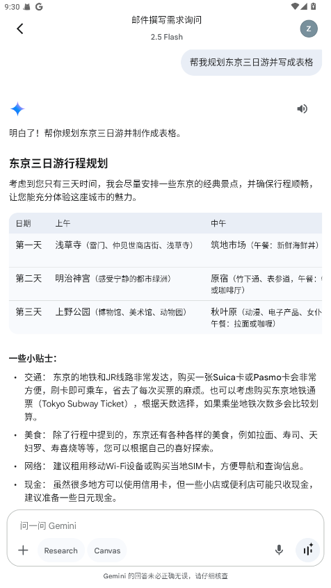 提出多步请求:如“帮我规划东京三日游并写成表格”。