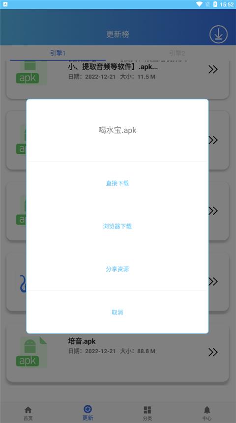 6、这里我们以喝水宝为例子,点击喝水宝apk我们即可直接下载,也可以选择浏览器进行下载,另外你还可以将资源分享给第三方小伙伴都是可以的。