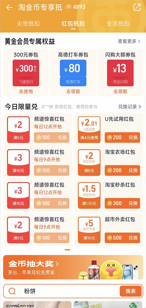 2、用来兑换红包和优惠券,在淘金币专区,能看到各种红包和优惠券,可以消耗相应数量的淘金币来进行兑换,兑换后的红包和优惠券在购物时可直接抵扣现金。