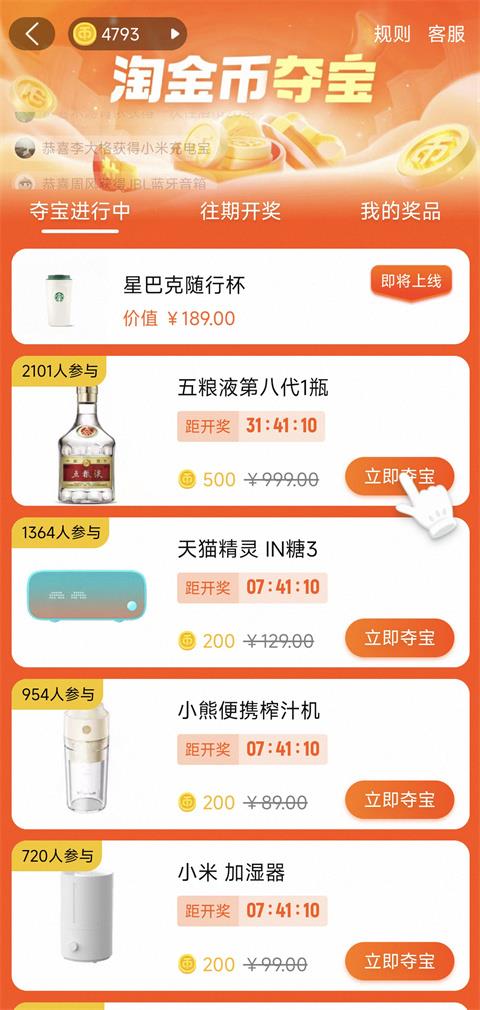 3、用来参与抽奖,点击图中的金币抽大奖,进入抽奖活动页面,点击“立即夺宝”,消耗相应数量的淘金币来参与抽奖。