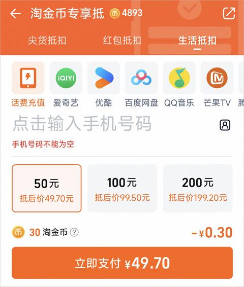 4、用来充话费、充值各种vip会员,在生活抵扣这里,选择你要充值的话费或vip会员,支付时淘金币就会自动进行抵扣。