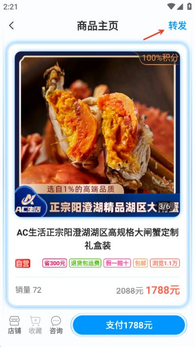 2、在商品页面点击右上角的转发。