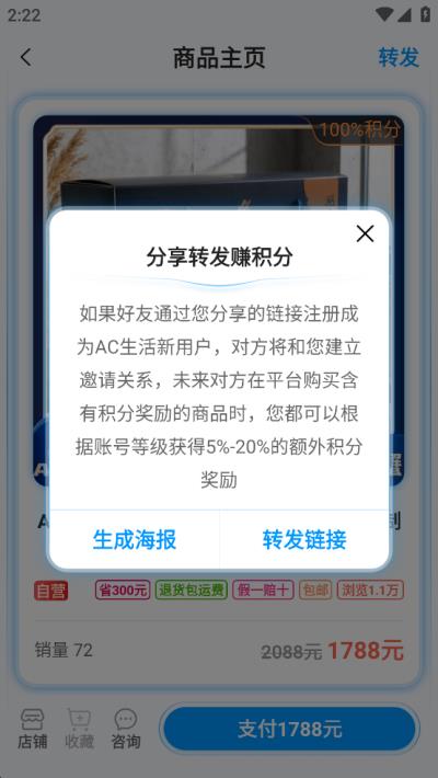 此外,ac生活平台会有各种活动举办,比如全民卖货大赛,只要你的卖货够多就也可以享受丰厚的卖货佣金和最高10万元的额外现金补贴以及积分,积分能够兑换离谱、虚拟礼物以及购买流量包等,感兴趣的小伙伴可以来下载体验。