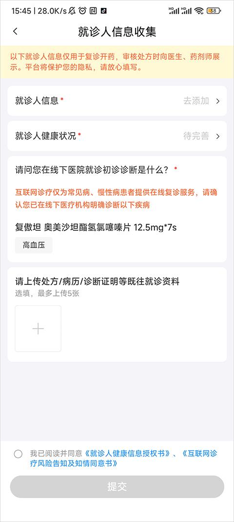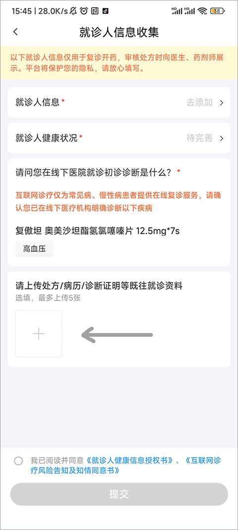 6、最后请将处方/病历/诊断证明等既往就诊资料上传,最后点击提交即可购买处方药