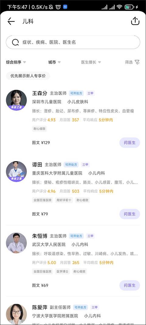 进入到儿科诊室后,大家可以通过观察各个医生的信息来选择自己问诊的医生。