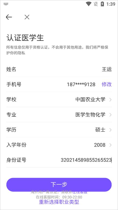 4、例如选择医学生认证后就可以在新打开的页面中输入姓名、学校、专业等信息后点击【下一步】