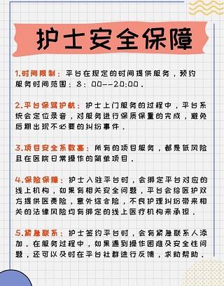 4、保险保障:护士入驻平台时,会绑定平台对应的线上机构,如果有相关安全问题,平台会给医护双方提供医责险,意外综合险,不良护理纠纷带来相关的法律风险均有绑定的线上医疗机构来承担。
