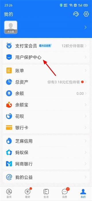 1、小编以支付宝为例,在我的界面中找到用户保护中心。